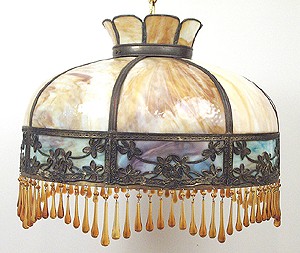 RESTORED. A beautiful example of a decorative hanging bent-glass dome, with 8 panels of large bent caramel swirl glass, and lower 8 panels of bent bluish/white swirl art glass. The crown piece also consists of bent caramel glass. The cast decoration around the lower section is an abstract floral over blue "sky". There has been 2 replaced panels of glass; also one blue panel is cracked, but nicely intact - it has been left alone for authenticity (although, it is easily replaceable). Old amber smooth tear-drops of varied size off the lower rim make a lovely breaking pattern to finish off the bottom. The 4-socket cluster is brass, and re-built in authentic style, with Handel acorn pulls.